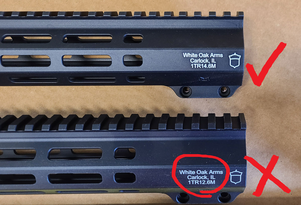 We have a number of our 14.6-inch TR Series MLOK handguards which are perfect in every way, except they were engraved with the incorrect length! The engraving on the side says 12.6 when the actual length of the handguard is 14.6 inches.